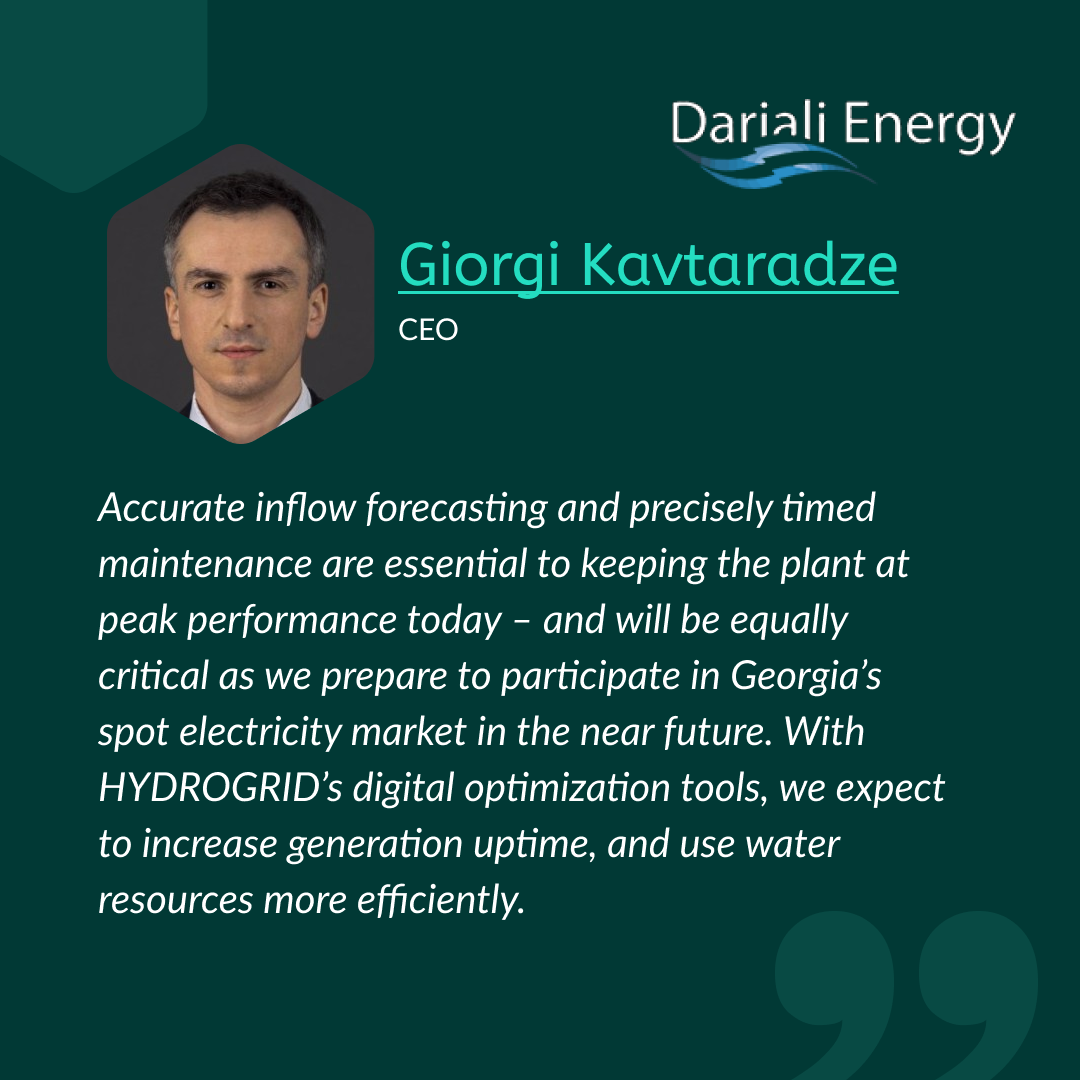 “Operating between 1,300 and 1,800 meters above sea level in a narrow Caucasus valley under harsh natural conditions presents unique challenges for the Dariali Hydropower Plant. Accurate inflow forecasting and precisely timed maintenance are essential to keeping the plant at peak performance today – and will be equally critical as we prepare to participate in Georgia’s spot electricity market in the near future. With HYDROGRID’s digital optimization tools, we expect to increase generation uptime, use water resources more efficiently, and further strengthen our commitment to sustainable and environmentally responsible operations.”